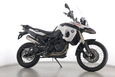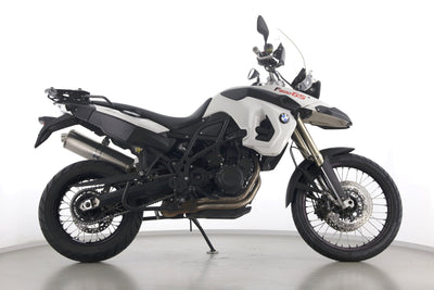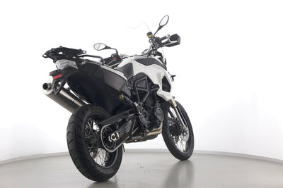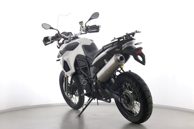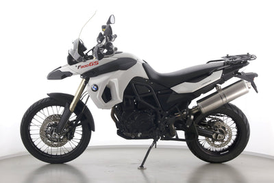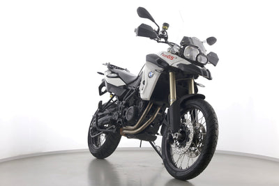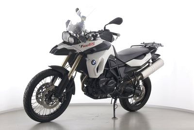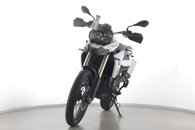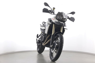 Eine BMW F 800 GS in gebrauchtem Zustand u.a. mit Drosselung auf 35 kW und Gepäckbrücke.