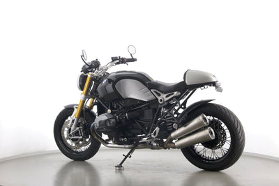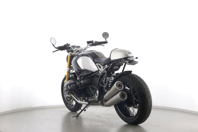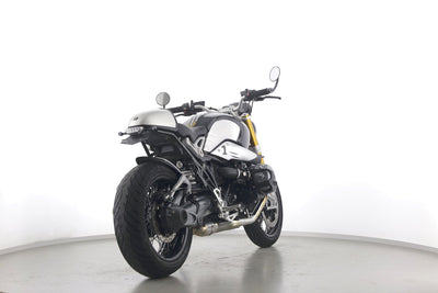 Eine BMW R nineT in gepflegtem Zustand u.a. mit Akrapovic-Doppel-Endschalldämpfer sowie kurzem Kennzeichenhalter.