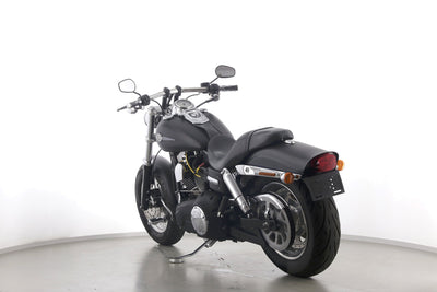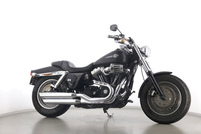 Eine Harley-Davidson Dyna Fat Bob FXDF in gepflegtem Zustand u.a. mit ScreaminEagle-Luftfiltergehäuse sowie Ledertasche am Rahmen.