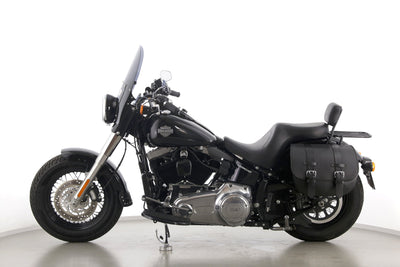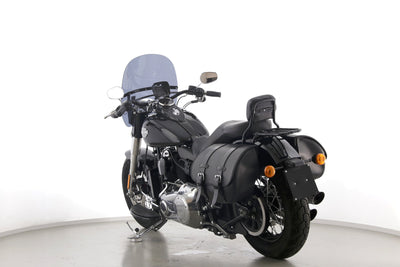 Eine scheckheftgepflegte Harley-Davidson Softail Slim FLS 103 aus zweiter Hand in sehr gepflegtem Zustand u.a. mit HD-Lederkoffern und Touring-Scheibe.