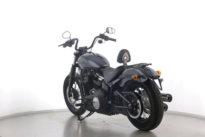 Eine scheckheftgepflegte Harley-Davidson Softail Street Bob FXBB aus zweiter Hand in sehr gepflegtem Zustand u.a. mit kurzem Kennzeichenhalter sowie Rick's-Brems- und -Kupplungshebel.