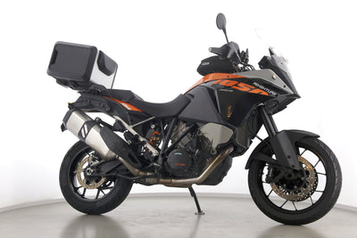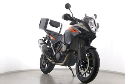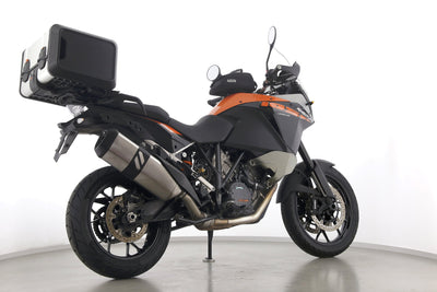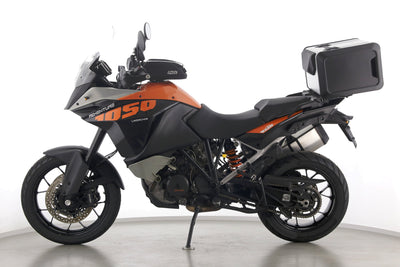 Eine KTM 1050 Adventure in gepflegtem Zustand u.a. mit KTM-Topcase und Tankrucksack.
