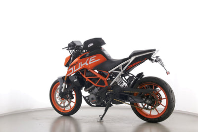 Eine scheckheftgepflegte KTM 390 Duke aus erster Hand in gepflegtem Zustand u.a. mit kurzem Kennzeichenhalter und KTM-Tankrucksack.