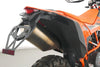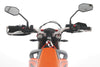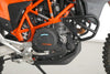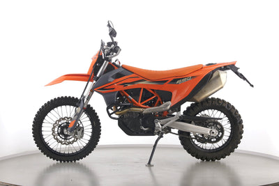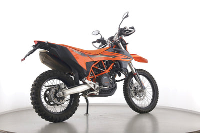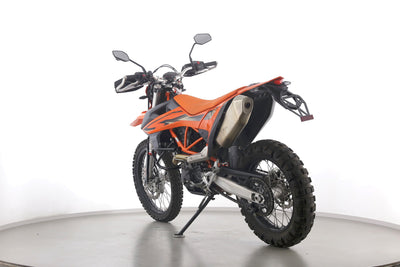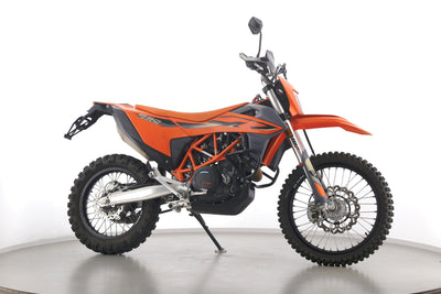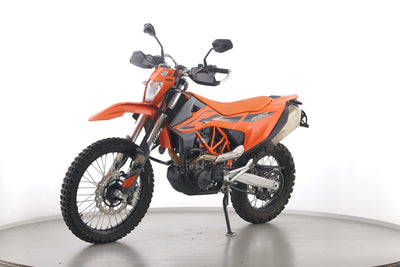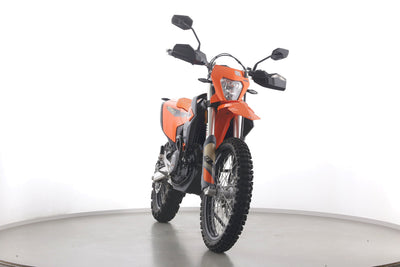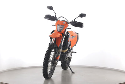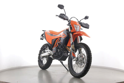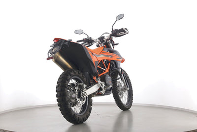 Eine KTM 690 Enduro R aus erster Hand in gebrauchtem Zustand mit Sturzbügel und LED-Blinkern.