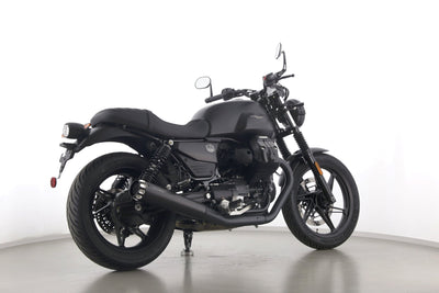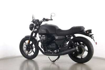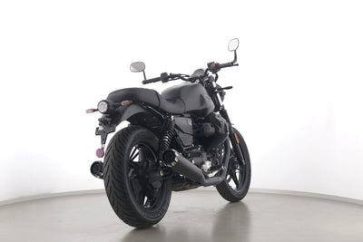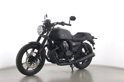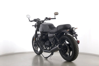 Eine Moto Guzzi V7 Stone als Neufahrzeug u.a. mit Mistral-Endschalldämpfer und Lenkerendenspiegeln.