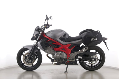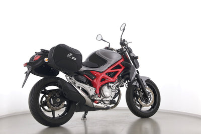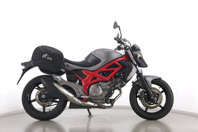 Eine Suzuki SFV 650 Gladius aus erster Hand in gebrauchtem Zustand mit Hepco & Becker-Packtaschensystem.