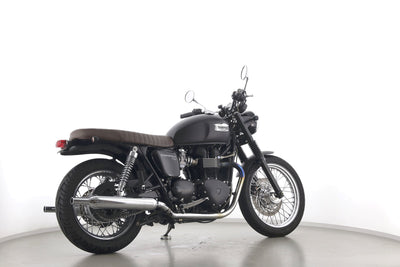 Eine Triumph Bonneville T100 in gepflegtem Zustand u.a. mit kurzem Kennzeichenhalter und Sonderlenker.